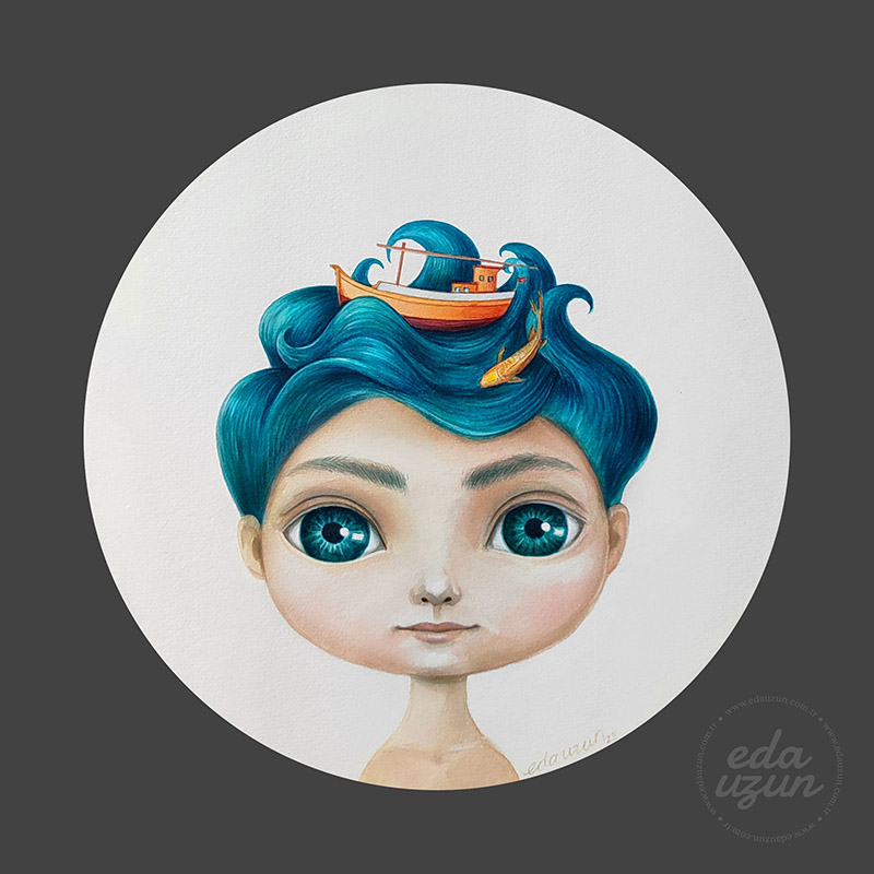 Blue-Haired Girl, Watercolor on Wood Panel and Paper, 35x35cm, 2023