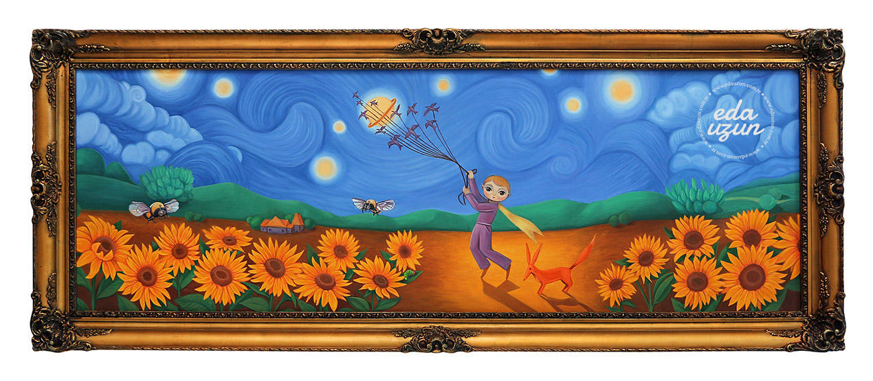 Little Prince and Fox, Mixed Media on Wood Panel, 50x150cm, (Frame 55x155cm) 2023