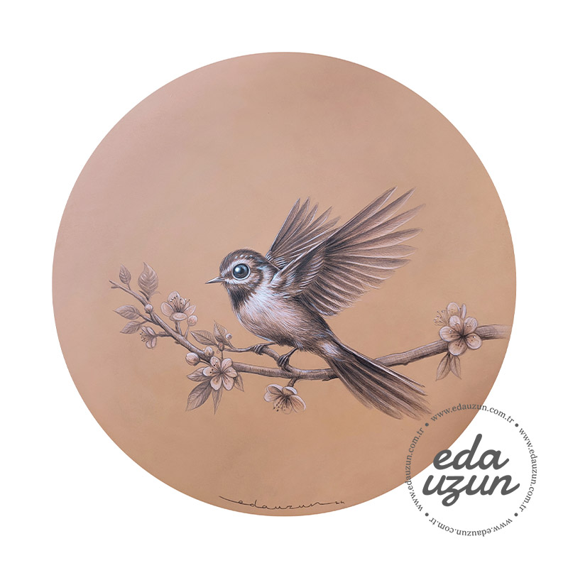 Cherry and Bird, 50cm, Mixed Media on Wooden Panel, 2024
