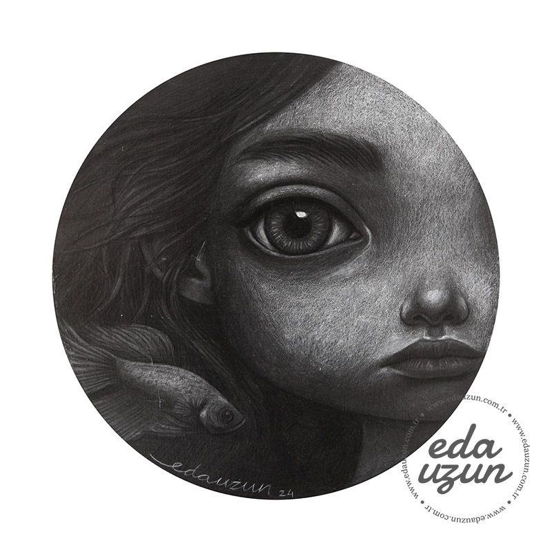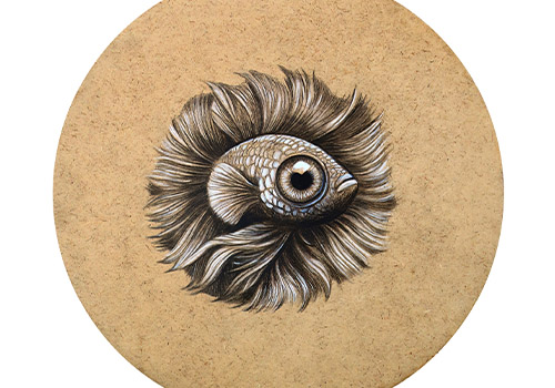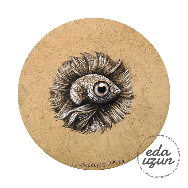 Big Eyed Fish, 25 cm diameter,, Dry paint on wooden plate, 2024