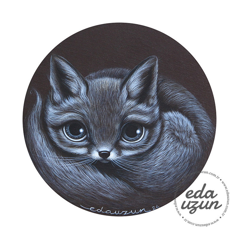 Huge Eyed Fox, Dry Paint on Wood Panel, 20 cm diameter x 2,5 cm, 2024