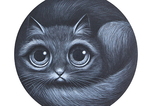 Huge Eyed Cat, 20 cm diameter, Dry paint and liquid acrylic on wood panel, 2024
