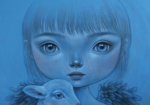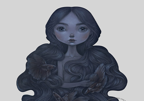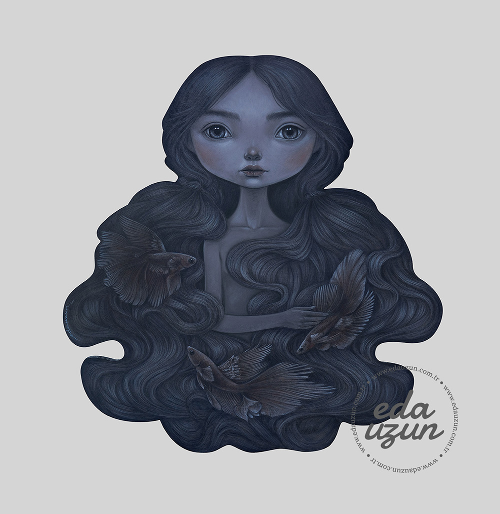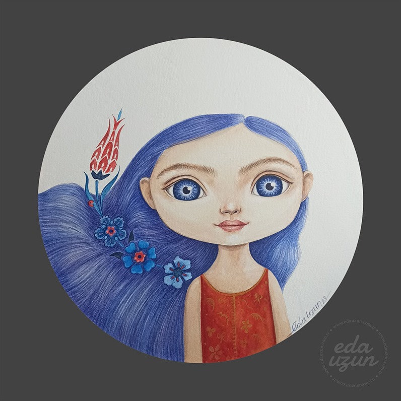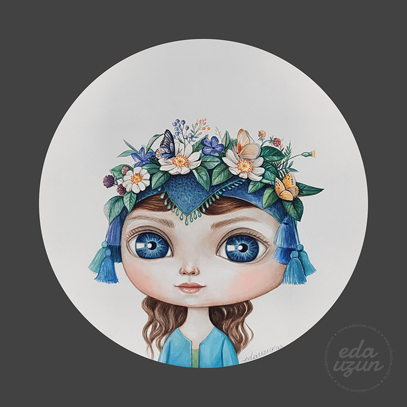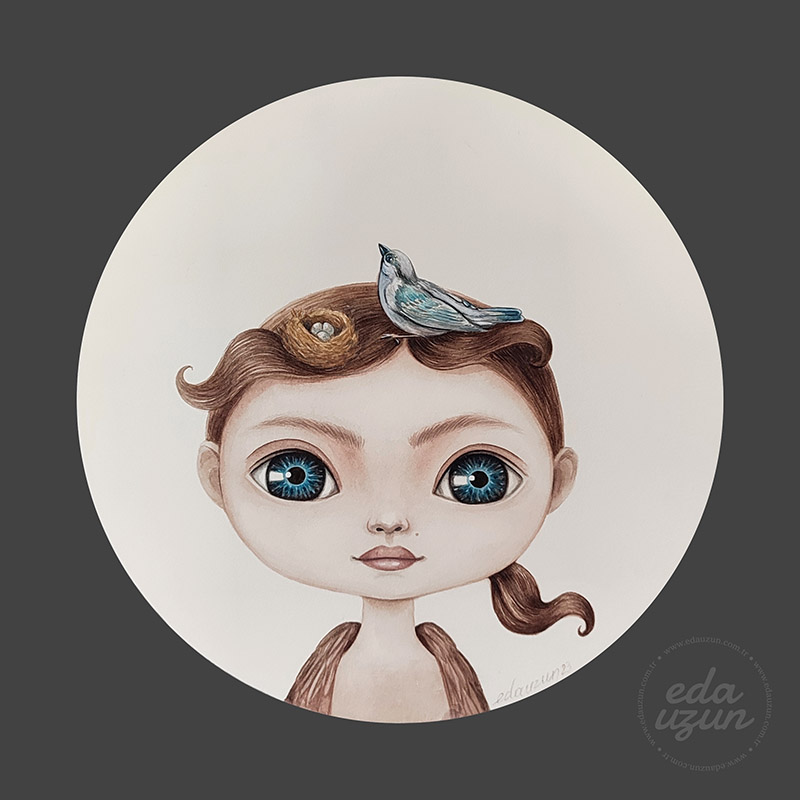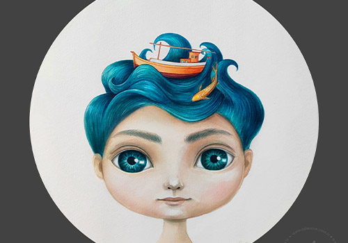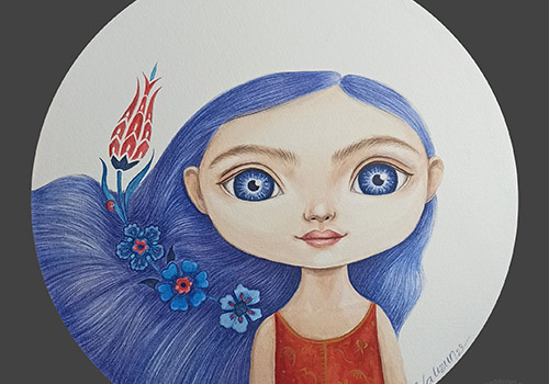 Blue-Haired Girl, Watercolor on Wood Panel and Paper, 35x35cm, 2023