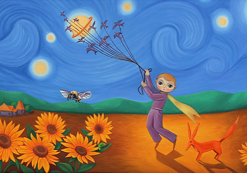 Little Prince and Fox, Mixed Media on Wood Panel, 50x150cm, (Frame 55x155cm) 2023