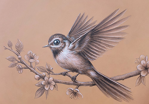Cherry and Bird, 50cm, Mixed Media on Wooden Panel, 2024