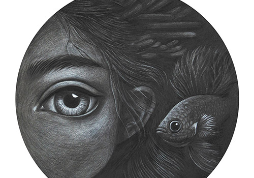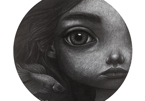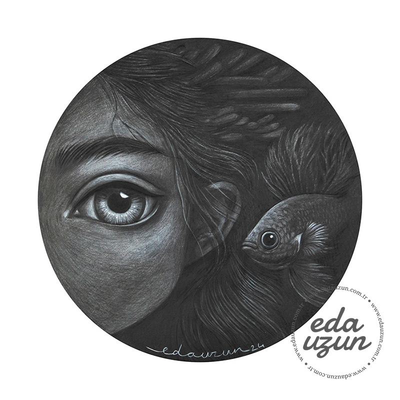 Big Eyed Fish, 25 cm diameter,, Dry paint on wooden plate, 2024