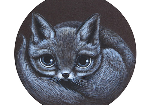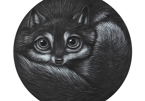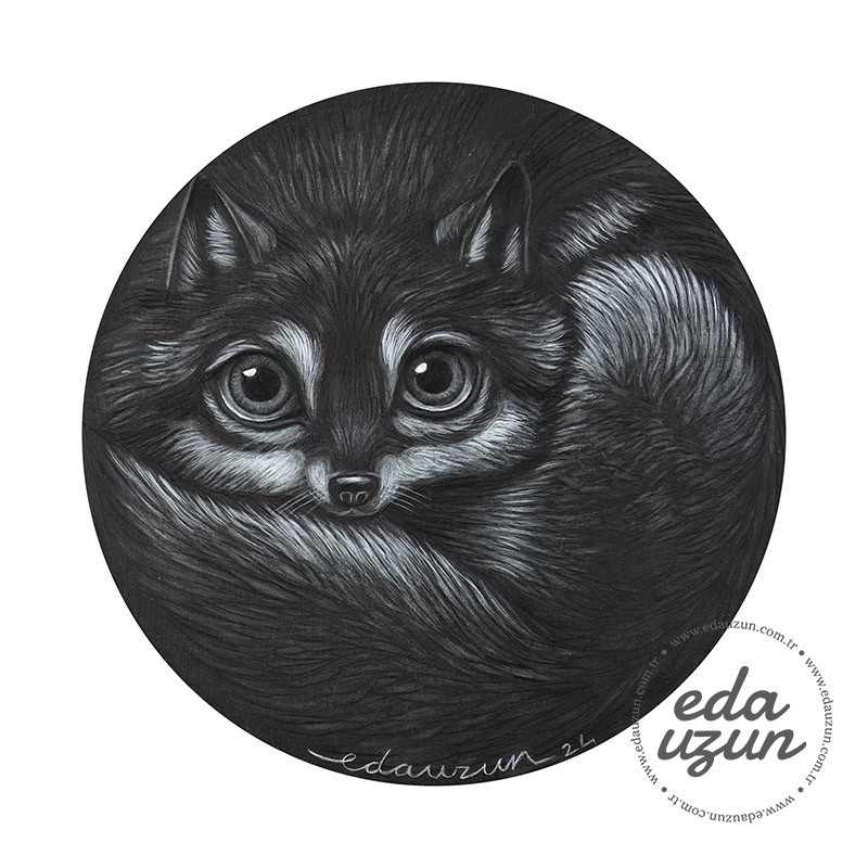 Huge Eyed Fox, Dry Paint on Wood Panel, 20 cm diameter x 2,5 cm, 2024