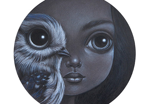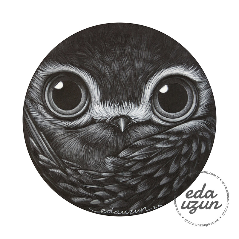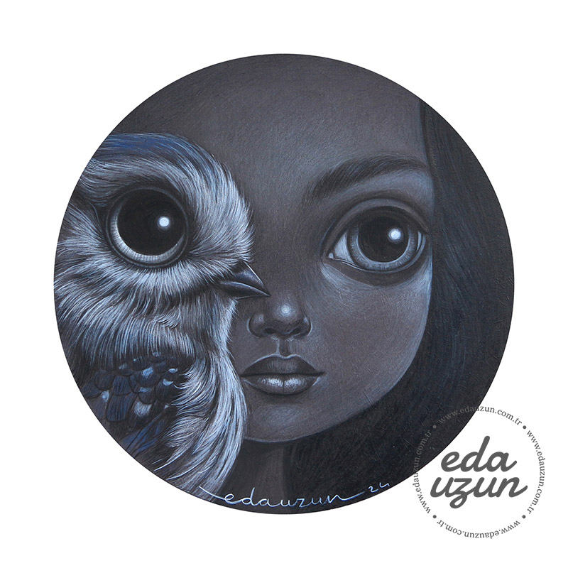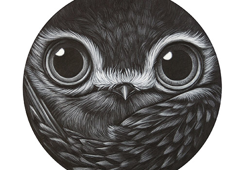 Big Eyed Owl, Dry Paint on Wood Panel, 22 cm diameter, 2024