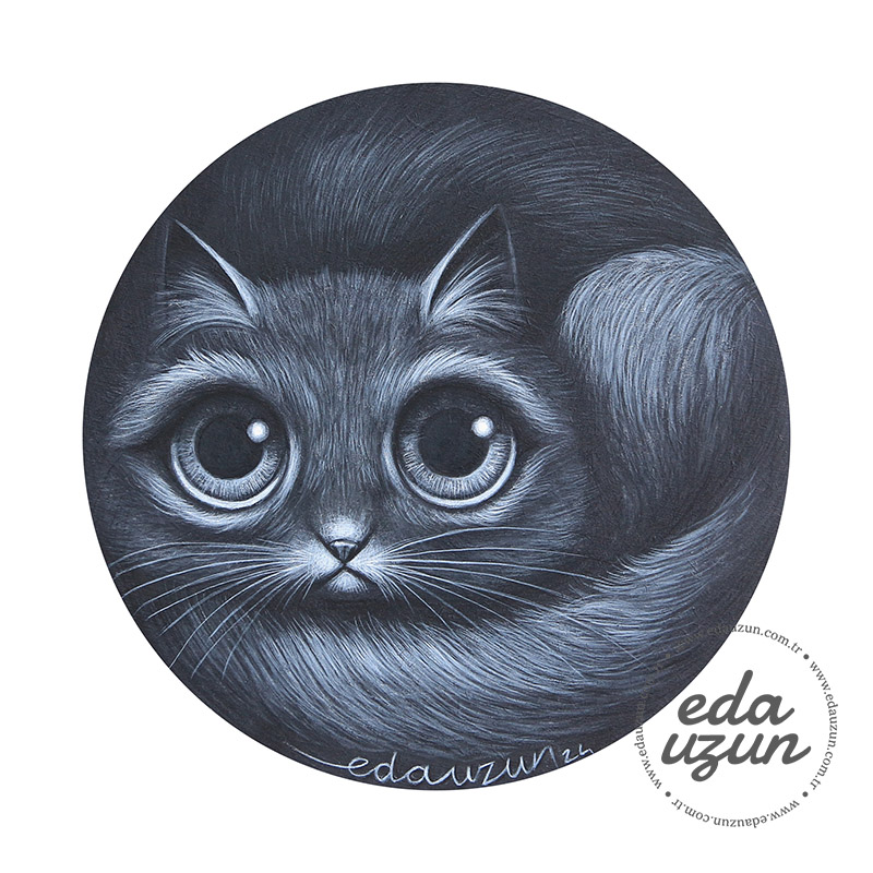 Huge Eyed Cat, 20 cm diameter, Dry paint and liquid acrylic on wood panel, 2024